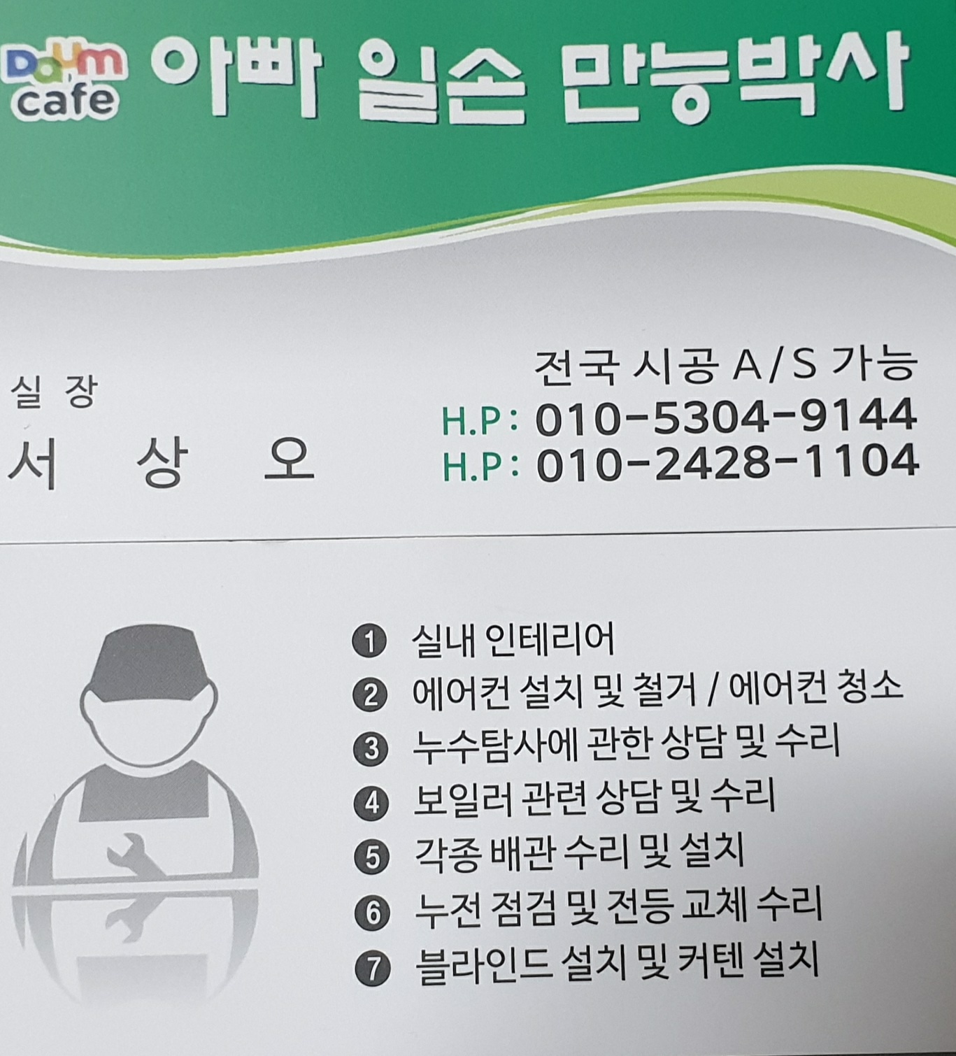 가능 분야 : 누수, 에어컨 설치, 부분 인테리어, 수도배관 등 집안 잡 공사 일체