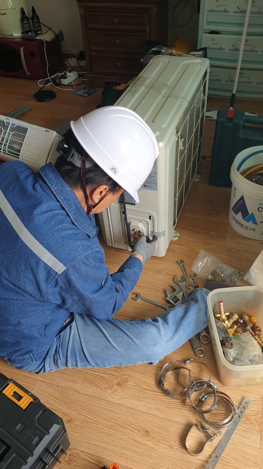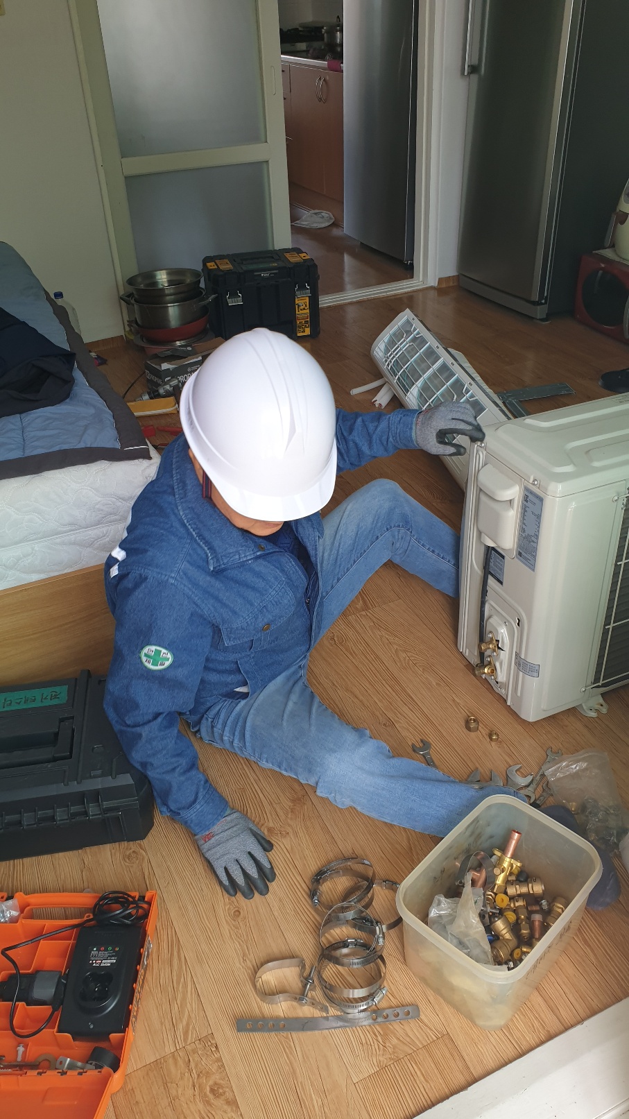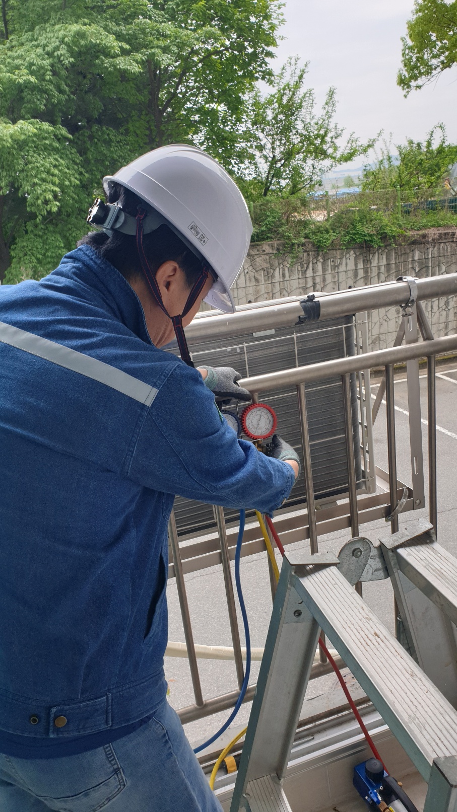 전선 연결, 배관 연결, 가스 충전 작업을 합니다.